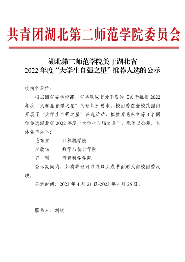 湖北第二师范学院关于湖北省2022年度“大学生自强之星”推荐人选的公示