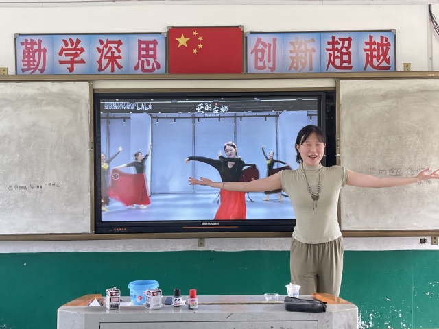 本网讯(通讯员 蔡贝贝)为丰富乡村儿童的假期生活,助力乡村的艺术教育,7月8日上午,湖北第二师范学院“四叶草青年志愿服务队”赴监利市分盐镇扒垱村桃花小学开展了三下乡实践活动,本次三下乡实践活动进行了汉唐舞《采薇》、傣族舞《花儿》、蒙古族舞《鸿雁》、维吾尔族舞蹈《亚丽古娜》等民族舞蹈鉴赏。在课堂上,学生在志愿者的教学下接触了解并学习关于舞蹈与民族的知识,通过图片、视频和志愿者示范讲解等多种形式,了解了不同民族的舞蹈特色。在课堂中,他们跟随音乐把课程中所学到的内容灵巧、欢快、生动形象地展现出来。志愿者在让学生快乐学习的同时,运用了中华民族的知识来传递能量,以民族舞蹈的形式来呈现艺术,让学生通过学习民族舞蹈,提高民族自信。