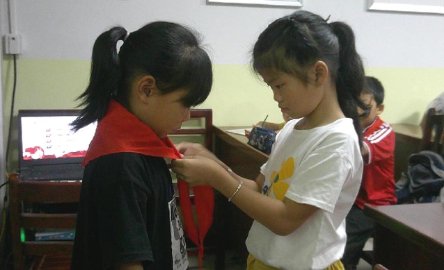 (图为 “蓓蕾”志愿服务队队员为不会系红领巾的学生悉心讲解,并手把手演示佩戴方法)