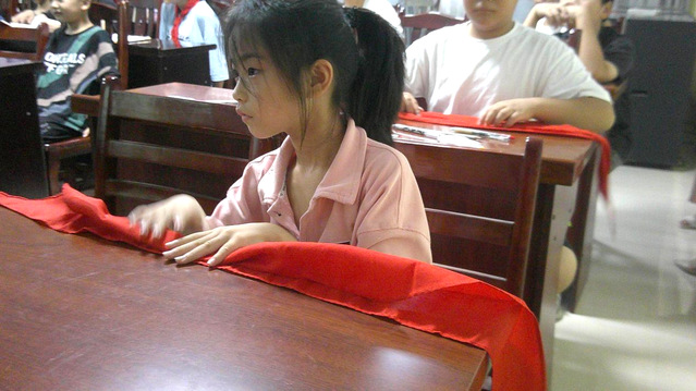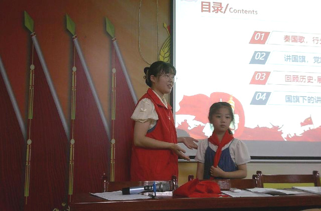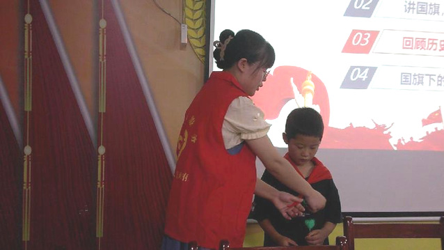 (图为 “蓓蕾”志愿服务队队员以一位学生做示范,向在座各位学生讲述红领巾的起源与象征含义)