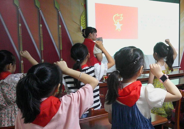 (图为 “蓓蕾”志愿服务队队员带领全体少年先锋队队员行少先队礼并重温入队仪式)