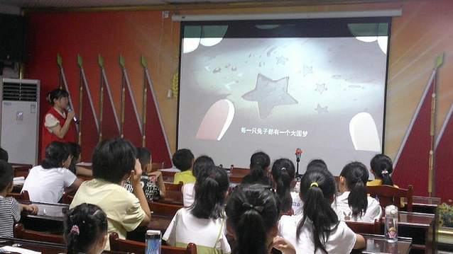 (图为 在座学生一同观看爱国主义教育动画短片,并由“蓓蕾”志愿服务队队员细心讲解)