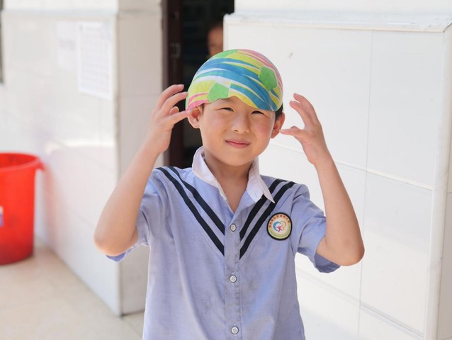 (图为小朋友戴上了在跳蚤市场上交换得到的彩色泳帽。中国青年网通讯员 夏宇涵 摄)