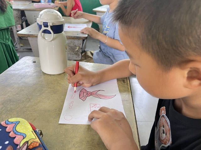 志愿者通过与学生互动,引入今天所讲的抗美援朝长津湖战役中冰雕连的故事。志愿者通过播放电影《长津湖》的故事情节,为学生讲述朝鲜战争中国人民志愿军的故事。学生们在观看过程中全神贯注,认真学习中国人民志愿军战士的故事,在观看完毕后,学生们纷纷发言:“我们要好好学习,热爱祖国,争做新时代好青年!”。学习完中国志愿军战士们的故事后,学生们跟着志愿者一起学习国歌《义勇军进行曲》,学生们坚定的举起右手,用歌声唱出对党和祖国道德热爱。为了让学生了解红领巾和国旗的组成,志愿者带领学生绘制国旗和红领巾。首先,志愿者向学生细致的讲解国旗的构成要素,学生们聚精会神地听着志愿者讲解国旗的组成和手工制作的步骤。在志愿者讲解完毕后,学生们全身心投入进绘画过程中,在志愿者的协作下,一个个带有国旗和红领巾的绘画作品就完成啦。