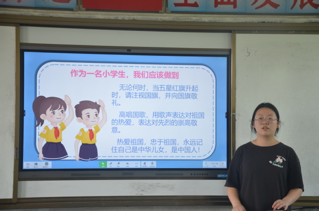 (图为志愿者带领学生学习在国旗下敬礼知识。通讯员 李文冠 摄)
