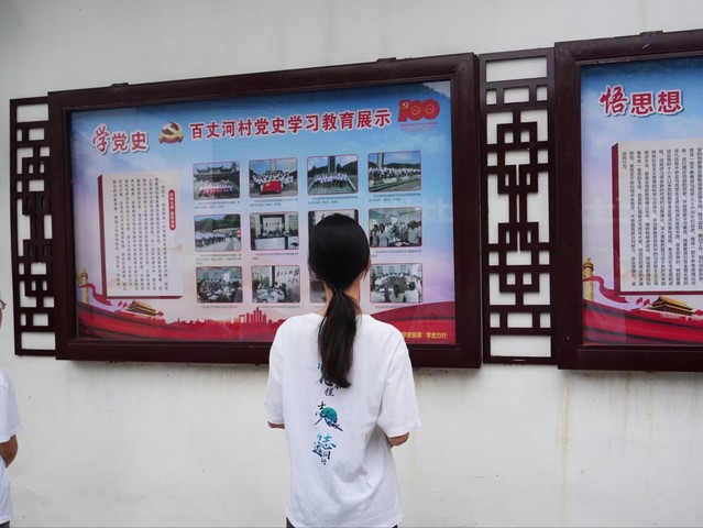 (图为实践队队员了解学习百丈河村的党史教育成果。中国青年网通讯员 江紫嫣 摄)
