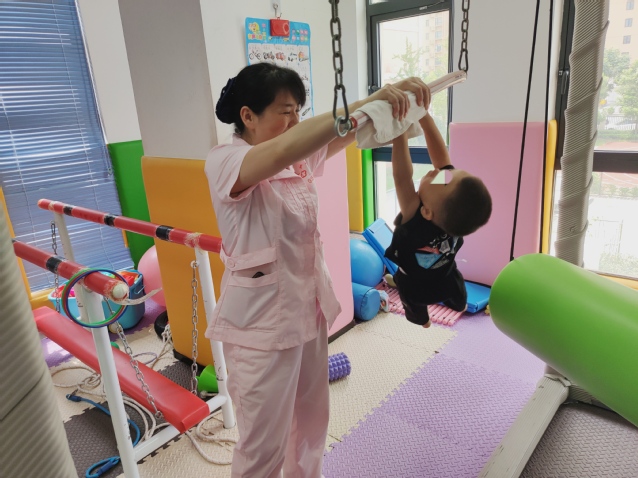 (图为康复中心的老师正在对残疾儿童进行身体机能的训练)