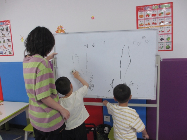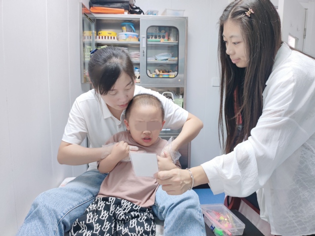 (图为志愿者在辅助康复中心的老师对孤独症儿童进行辨认物体的训练)