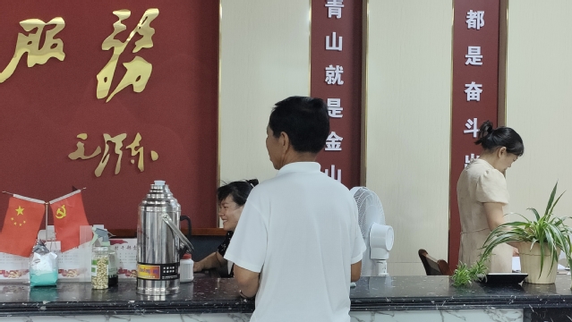 (图为百丈河村村民服务中心中,村民向工作者咨询问题,她们热情解答,践行为人民服务的宗旨)