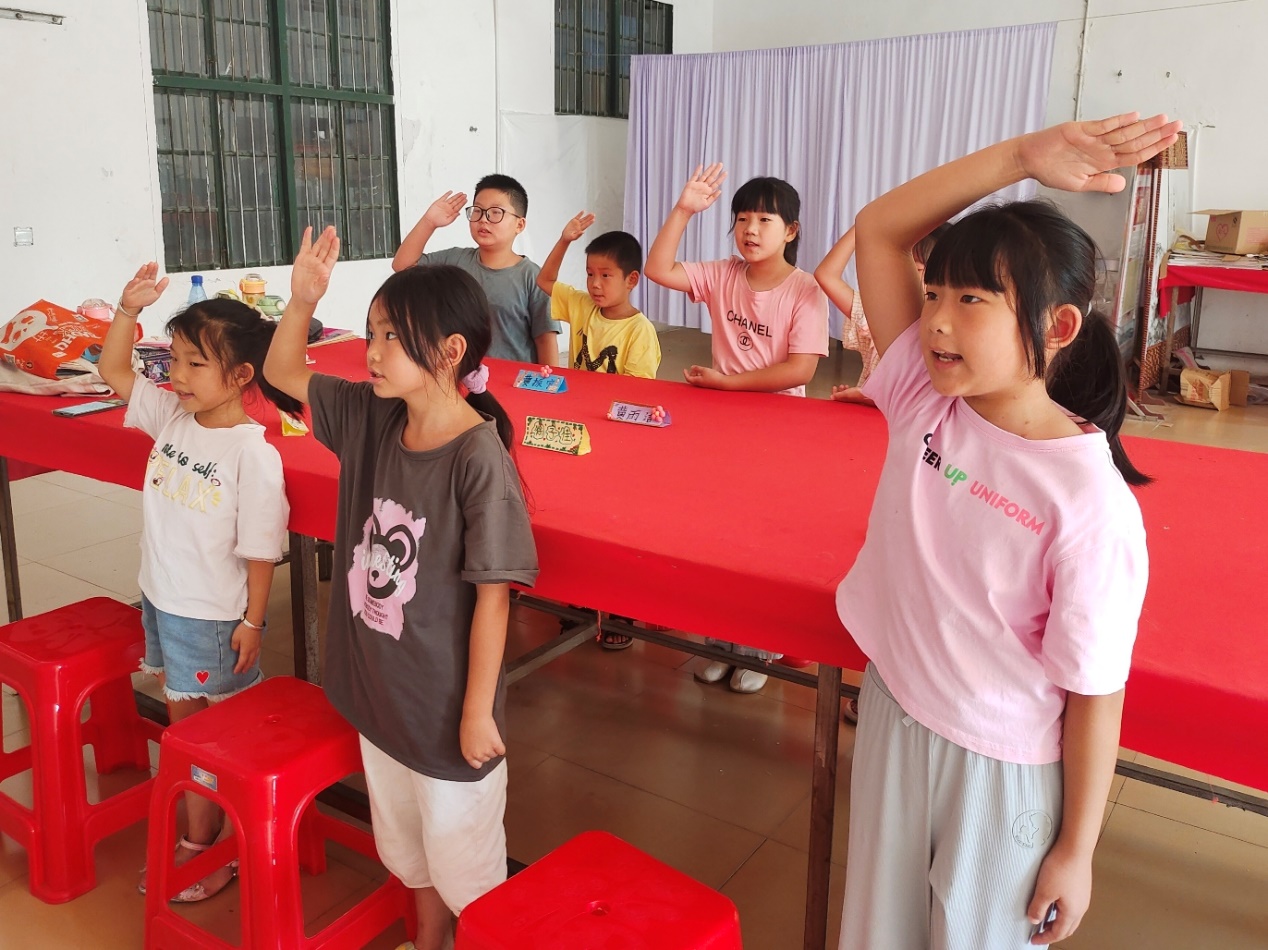 为深一步培养儿童们的爱国主义精神,实践队队员进行了国歌以及少年队队礼的教授,并且对行礼不到位的儿童进行一对一纠正。实践队队员以严肃而柔和的态度教唱国歌,儿童们也表现出学习国歌的认真、仔细。