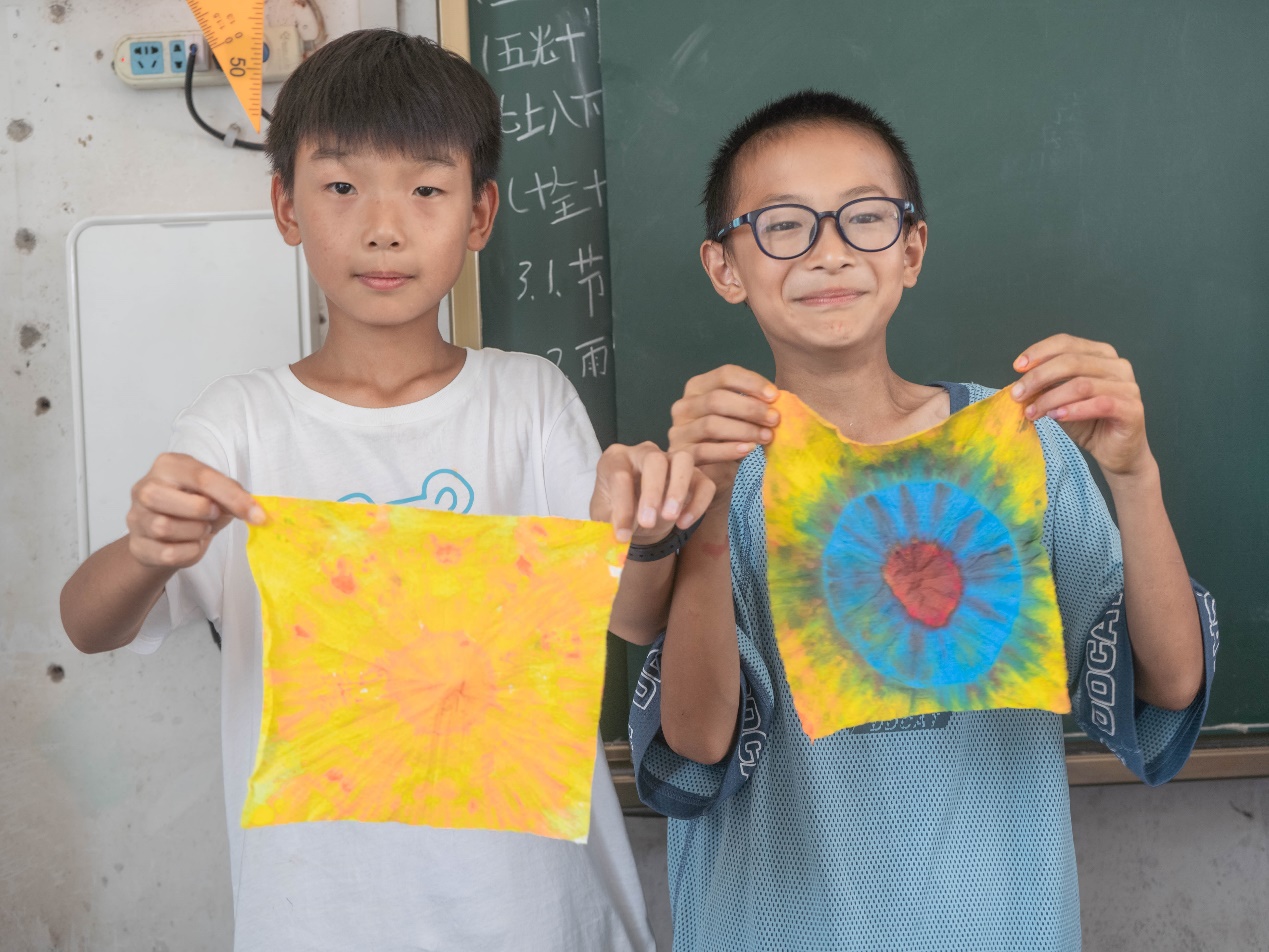 在来刘洲小学的前一个月,我们志愿服务队就开展了一系列的前期准备工作。深思熟虑,我决定为小朋友们上扎染课。从选课、备课、到最后选择扎染材料,我准备了近一个月的时间。但当我第一次以老师的身份站上讲台为孩子们传授知识时,还是紧张万分。讲课的前一天晚上,我对着打磨了很多遍的PPT反复练习,一边担心自己讲不好,一边担心孩子们不配合。第二天,我带着教案和教具忐忑地走上讲台。当我放好PPT转过身时,看到小朋友们用亮晶晶的眼睛盯着我,清澈好奇的眼光给了我莫大的鼓励,我心中的不安与担忧消减大半。课堂上的每个提问,小朋友们都积极踊跃地举手。尤其在动手扎染的环节,小朋友们兴致勃勃,从捆扎到染色,每一个过程都十分专注。下课后不少学生把自己的作品展示给我看,我心里一片温暖。