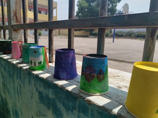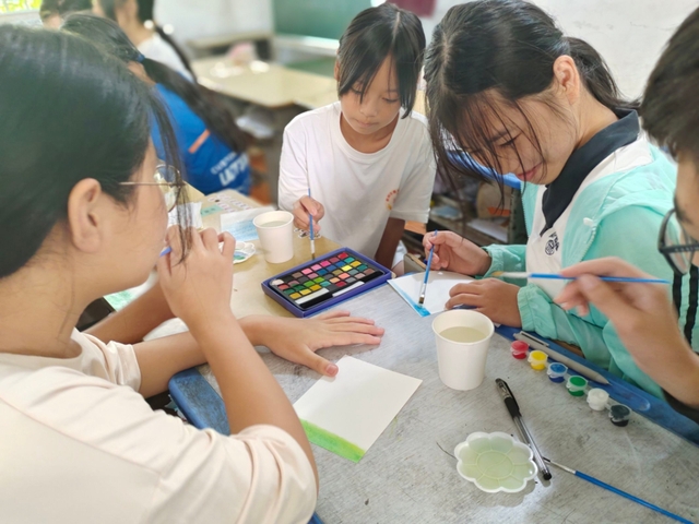(图为学生合作制作手工作品,在手工作品上涂色)