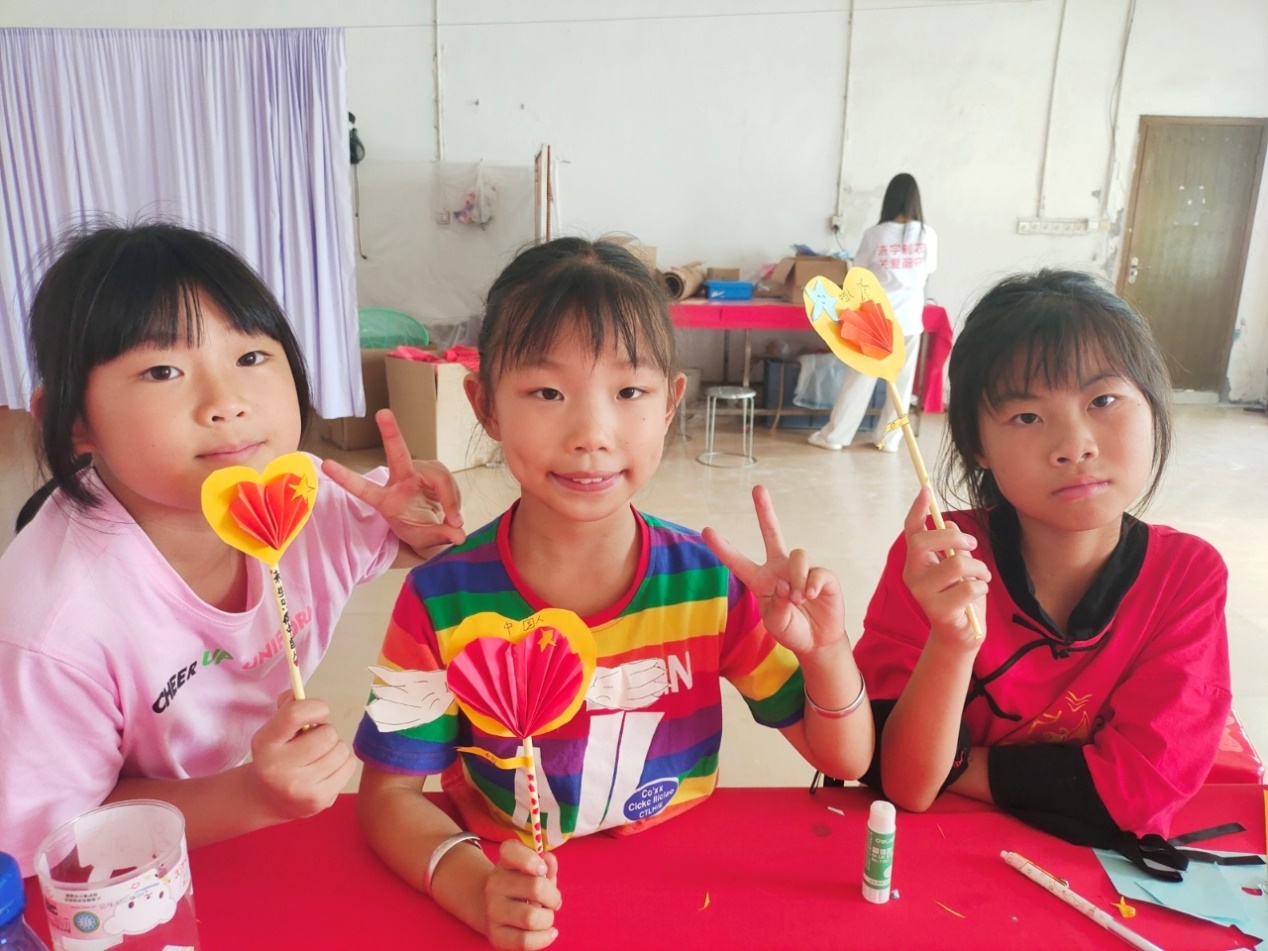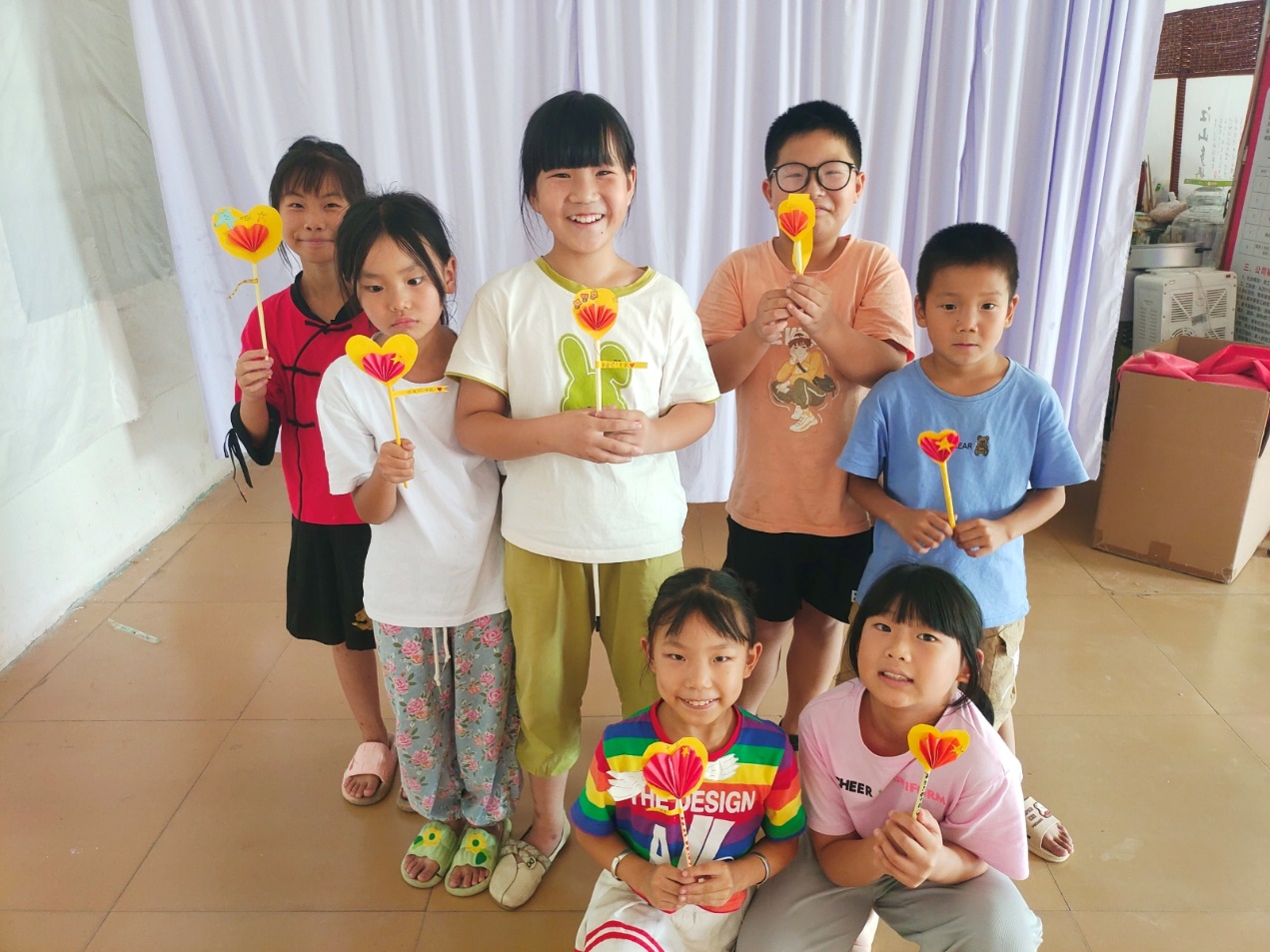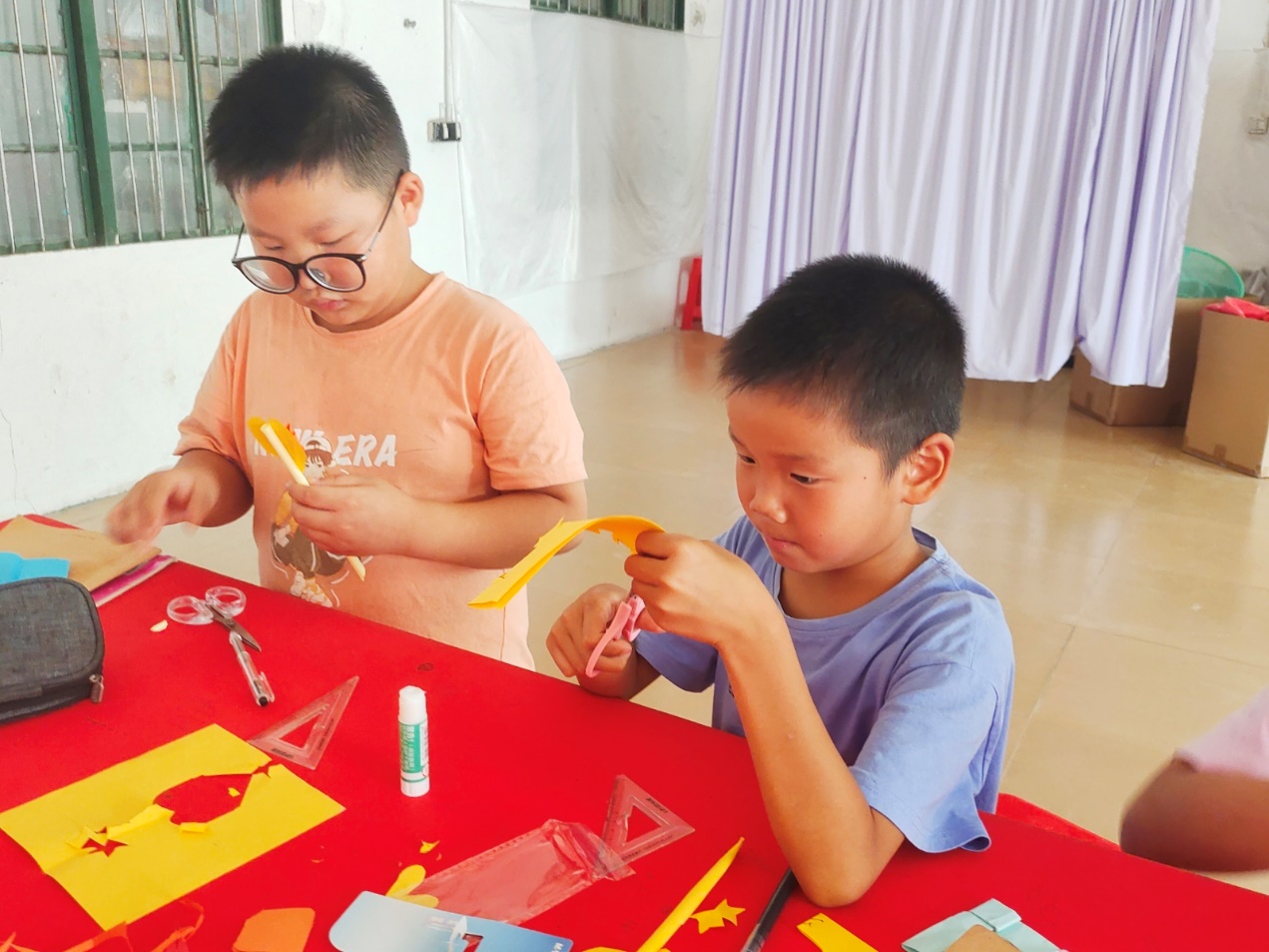 本网讯(通讯员 张雨涵)为关爱留守儿童,促进儿童认知能力的成长,培育儿童的基本美感,提升儿童动手能力。7月17日,湖北第二师范学院教育科学学院赴监利市四叶草青年志愿队第7分队在龚场镇浩宇制衣“希望家园”托管点对该点的儿童开展了以“趣味手工,童心向党”为主题的爱国主题手工制作活动。在活动中,志愿者带领儿童们按步骤制作爱心、五角星、细纸棒等物,以红色与黄色的党徽配色、以“我爱你中国!”和“我是中国人!”的热烈言语表达出对于祖国的热爱。儿童们在爱心棒上自由发挥,添加上“横条长标”、“萌趣星星”、“爱心贴纸”、“梦想翅膀”等富有意义的装饰物,每个孩子的创意都十分有趣,大家以不同的角度,共同表达出对于未来的憧憬和祖国的感情。活动最后,孩子们集体展示作品,以一首齐唱的“我爱你中国”将活动收尾。