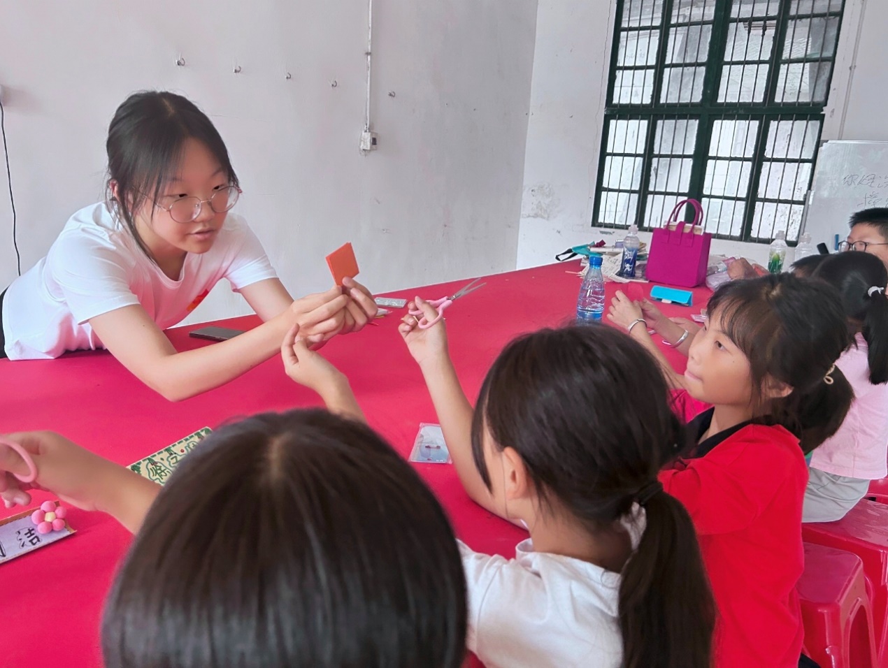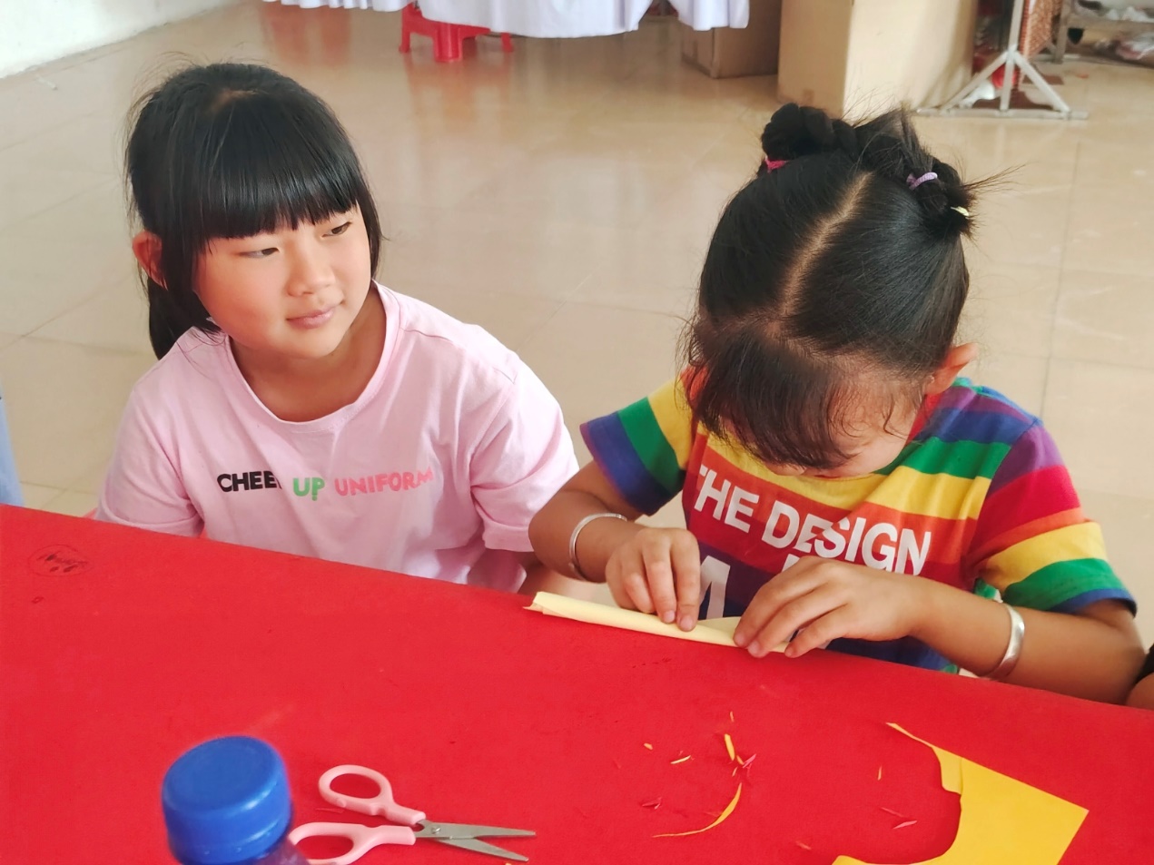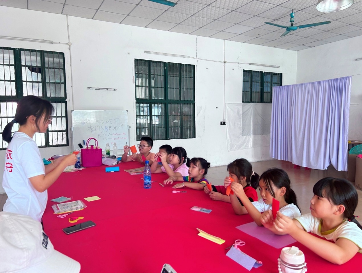 本网讯(通讯员 张雨涵)为关爱留守儿童,促进儿童认知能力的成长,培育儿童的基本美感,提升儿童动手能力。7月17日,湖北第二师范学院教育科学学院赴监利市四叶草青年志愿队第7分队在龚场镇浩宇制衣“希望家园”托管点对该点的儿童开展了以“趣味手工,童心向党”为主题的爱国主题手工制作活动。在活动中,志愿者带领儿童们按步骤制作爱心、五角星、细纸棒等物,以红色与黄色的党徽配色、以“我爱你中国!”和“我是中国人!”的热烈言语表达出对于祖国的热爱。儿童们在爱心棒上自由发挥,添加上“横条长标”、“萌趣星星”、“爱心贴纸”、“梦想翅膀”等富有意义的装饰物,每个孩子的创意都十分有趣,大家以不同的角度,共同表达出对于未来的憧憬和祖国的感情。活动最后,孩子们集体展示作品,以一首齐唱的“我爱你中国”将活动收尾。