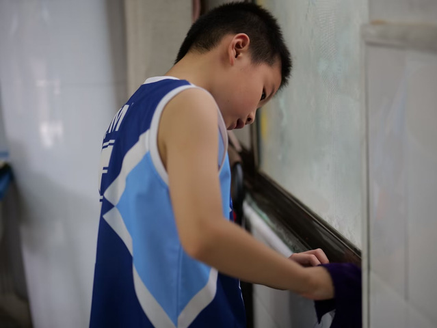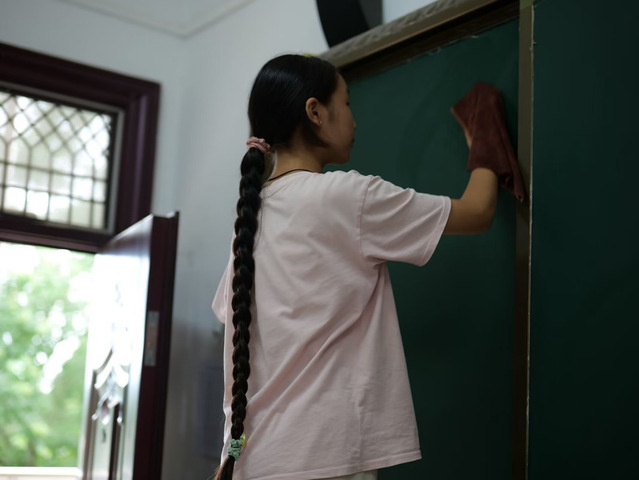 (图为六年级的孩子仔细擦拭教室黑板)