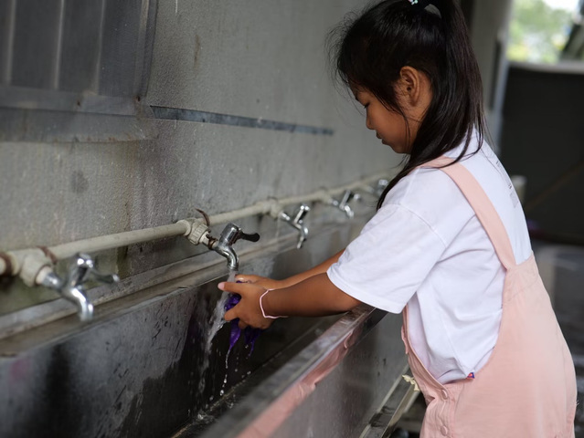 (图为二年级的孩子认真冲洗抹布)