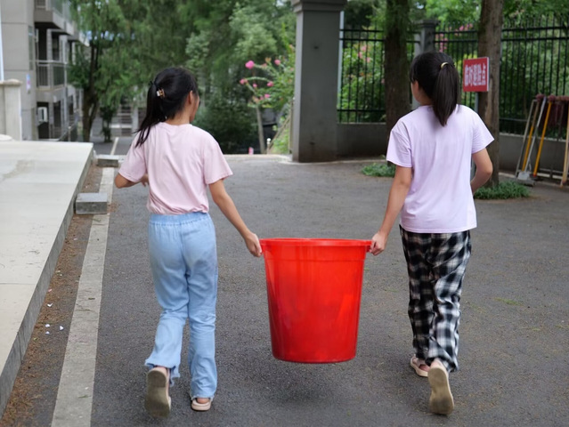 (图为四年级的孩子一起合作完成倒垃圾的劳动任务)