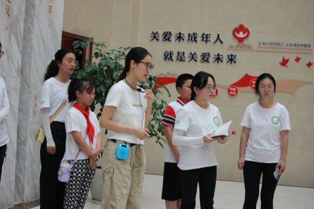 (图为志愿者老师同学生在讲解员的带领下参观红色展厅,大家都在认真聆听)