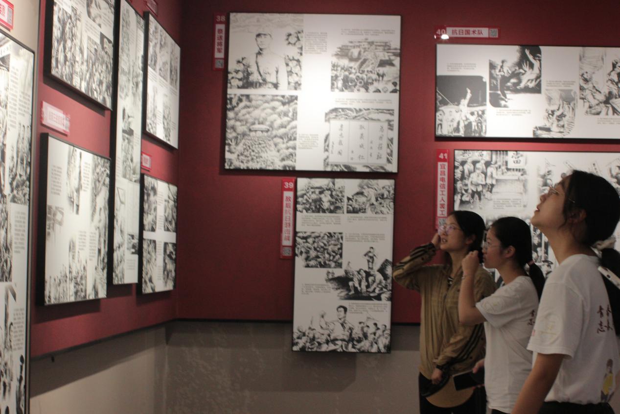 (图为“自强思源”社会实践队成员参观宜都党史故事连环画展《峥嵘岁月》)