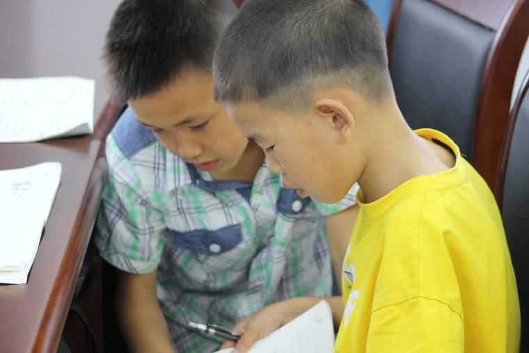 (图为作业辅导课上正在给同桌讲解习题的小朋友)