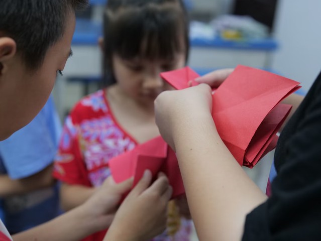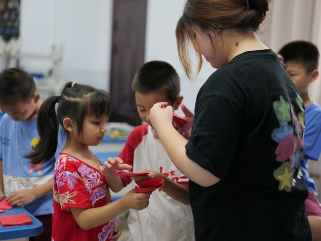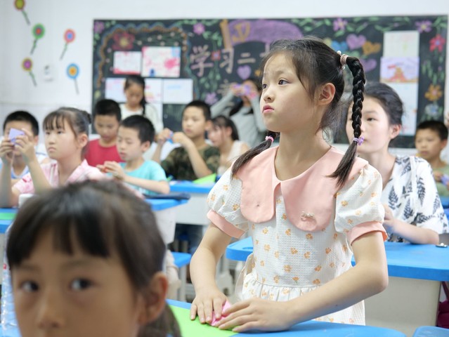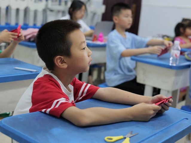 本网讯(通讯员 涂雨嫣)为了深入贯彻落实“双减”政策,加强对孩子们的美育教育,7月18日,“缘梦”志愿服务队在崇阳县第三小学大白校区开展了手工创意特色课程,课上,老师为学生讲解折纸步骤并进行示范,小朋友们认真地跟着老师的步骤操作,在师生的共同努力下,学生们都成功制作了一个战斗机。
