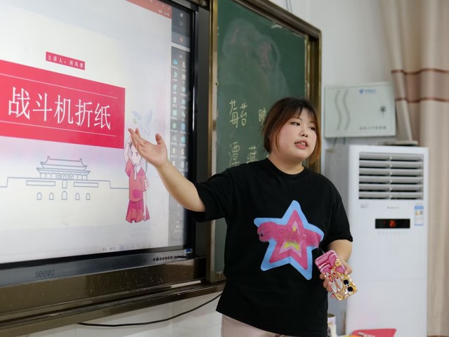 (图为老师为学生们进行折纸示范,耐心地讲解,同学们认真地跟着老师的步骤折着属于自己的战斗机。通讯员 覃雨欣 摄)