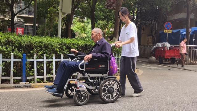(图为志愿者帮助路边轮椅故障的老人前往目的地)