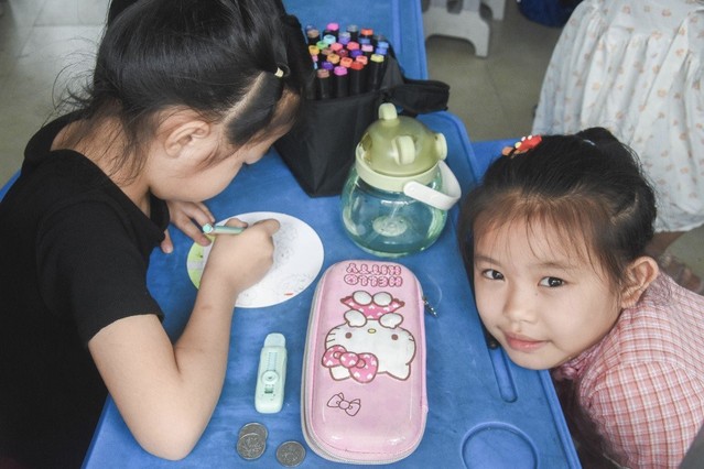 (图为学生在专心画画,为自己的画添色。中国青年网通讯员 夏宇涵 摄)