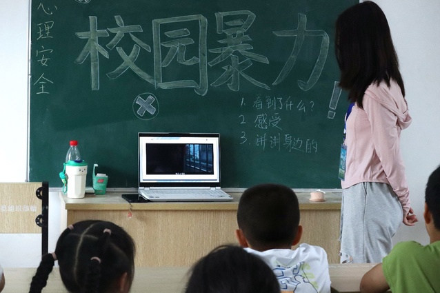 (图为志愿者老师为孩子们播放有关校园暴力视频,并根据视频提出三个问题)