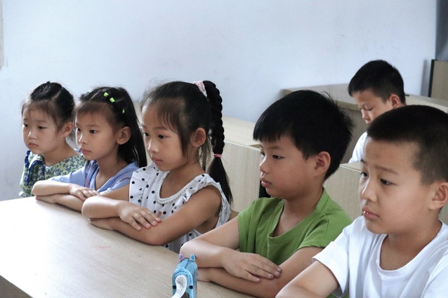 (图为孩子们认真听志愿者老师授课有关校园暴力的知识)