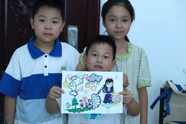 (图为孩子们向志愿者老师展示他们做的有关反校园暴力手抄)