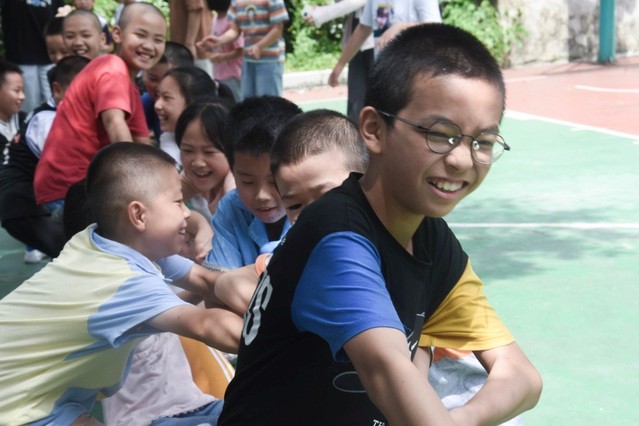 (图为小朋友们正在拼尽全力地进行拔河比赛)