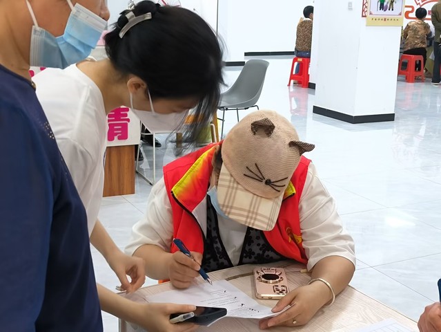 (图为实践队员邀请社区服务者填写调查问卷,实践队员向社区服务者介绍了问卷调查的原因和用途,社区服务者积极参与并对社区老年服务提出自己的见解。中国青年网通讯员 刘璐 摄)