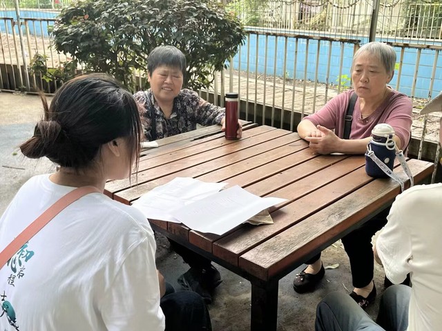 (图为志愿服务队成员采访社区居民,了解居民心声,居民与志愿服务队成员积极分享社区老年服务建设的优缺点,实践队员在欢声笑语中拉近了与居民的距离。中国青年网通讯员 刘璐 摄)