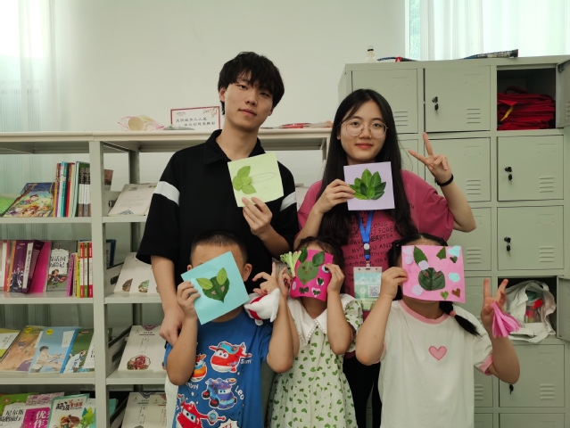 (图为志愿者和小朋友们展示“叶片画”手工作品)