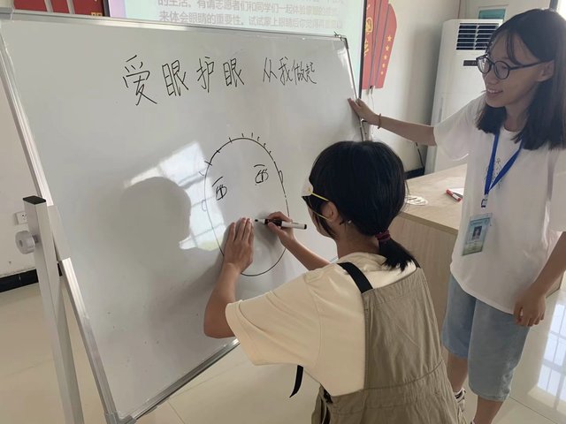 之后的课堂中,志愿者用通俗易懂的语言向孩子们普及了正确的用眼方法并强调了长时间盯着屏幕、用电子产品过度等不良习惯对眼睛的危害,并教授了眼睛保护的实用技巧,如定时休息、远离光线强烈的环境。