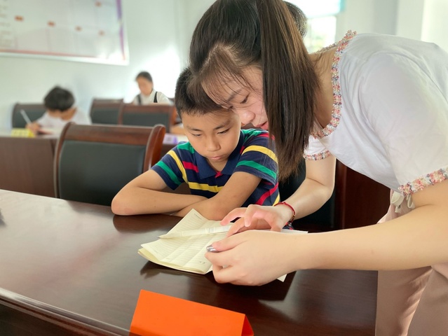 (图为志愿者帮助孩子们辅导暑期作业,孩子们也认真听取志愿者的讲解)