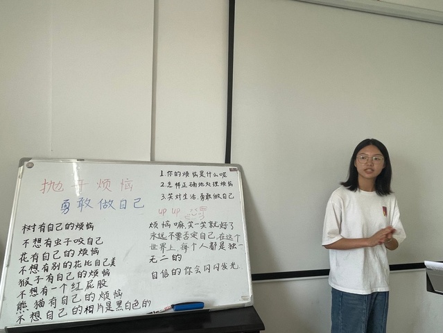 (图为志愿者带领学生们开展心理健康教育课堂,她向孩子们讲授解决烦恼的重要性并鼓励孩子们说出自身烦恼)