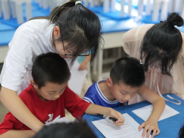 (图为志愿者帮助低年级的小朋友读生词。通讯员 覃雨欣 摄)