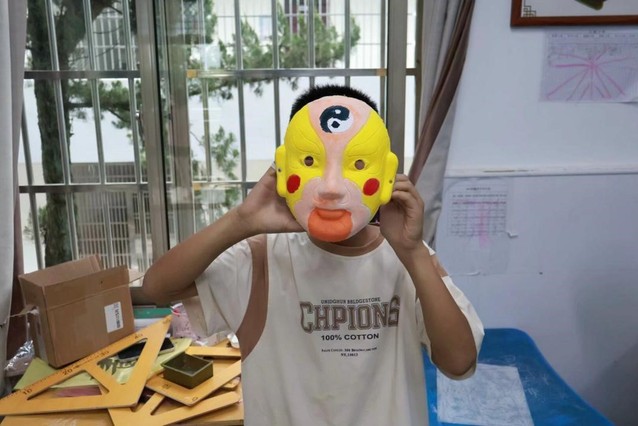 (图为小朋友戴脸谱面具向志愿者展示。通讯员 赵梓夷 供图)