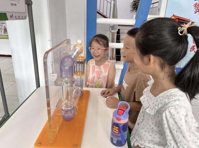 防溺水安全教育座谈课结束后,科技馆参观自由行就正式开始了。在科技馆一楼展厅中央,绿色的科学现象体验设施鳞次栉比地排列着:有转动按钮可以让光线跳舞的激光装置,有红外线血管成像的器材;有“窥视镜”下不同图案的成像屏幕;有会随着音乐节拍起舞的“跳舞”回形针;还有会放电的麦克风“音乐特斯拉”……小朋友们在亲身体验不同科学现象的同时,还可以通过设备器材上的介绍板了解实验原理,边玩别学,置身于科学的殿堂,印证科学的结论,提炼科学的方法,感悟科学的态度。