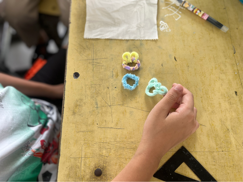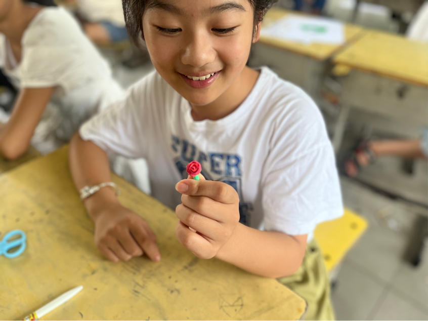 志愿者先提问学生,母亲节是什么时候。同学们都异口同声地回答道,“每年的第二个星期天。”紧接着,志愿者让同学们回忆母亲为自己做过什么,教室里响起叽叽喳喳的讨论声,志愿者引导学生发现母亲为自己做过很多,并让学生用自己已有的粘土、扭扭乐、纸张,为母亲做出一些东西,送给她。同学们充分发挥自己的想象力,捏造出玫瑰花,扭出戒指,折出纸玫瑰,以此表达对母亲的感谢。