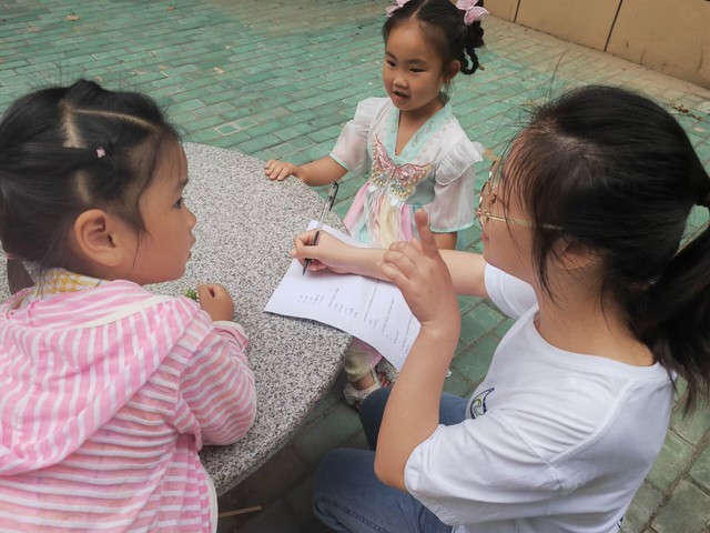 (图为志愿服务队成员与社区小朋友进行交流沟通,小朋友们言语稚嫩,却也积极表达自己的想法。通讯员 刘璐 摄)