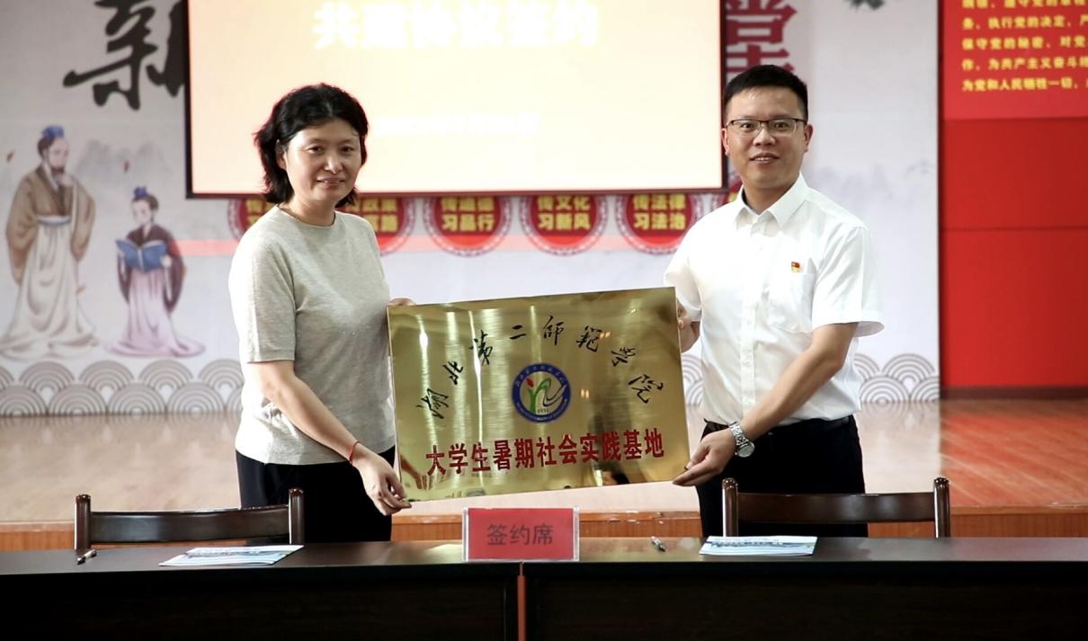 (图为胡书记与李书记同执湖北第二师范学院大学生社会实践基地牌匾)