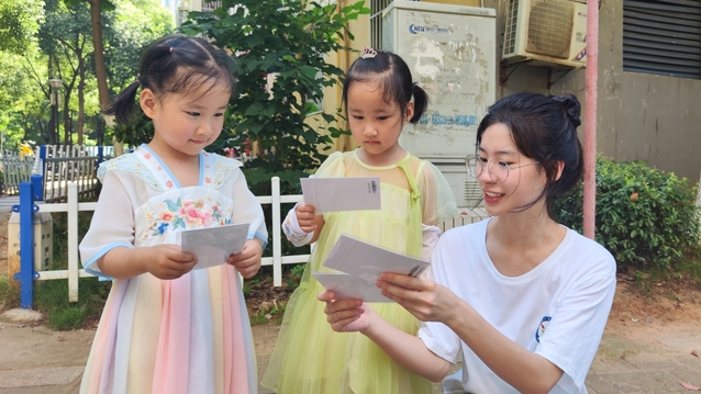 (图为志愿者和小朋友一起辨别有关心理认知的卡片)