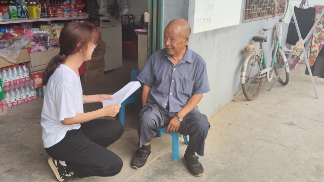 (图为志愿者与当地农户交谈空巢老人心理健康问题)