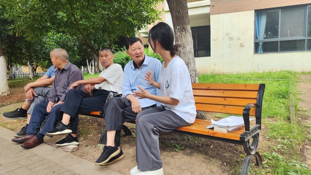 (图为志愿者与乘凉的老人们洽谈养老问题)