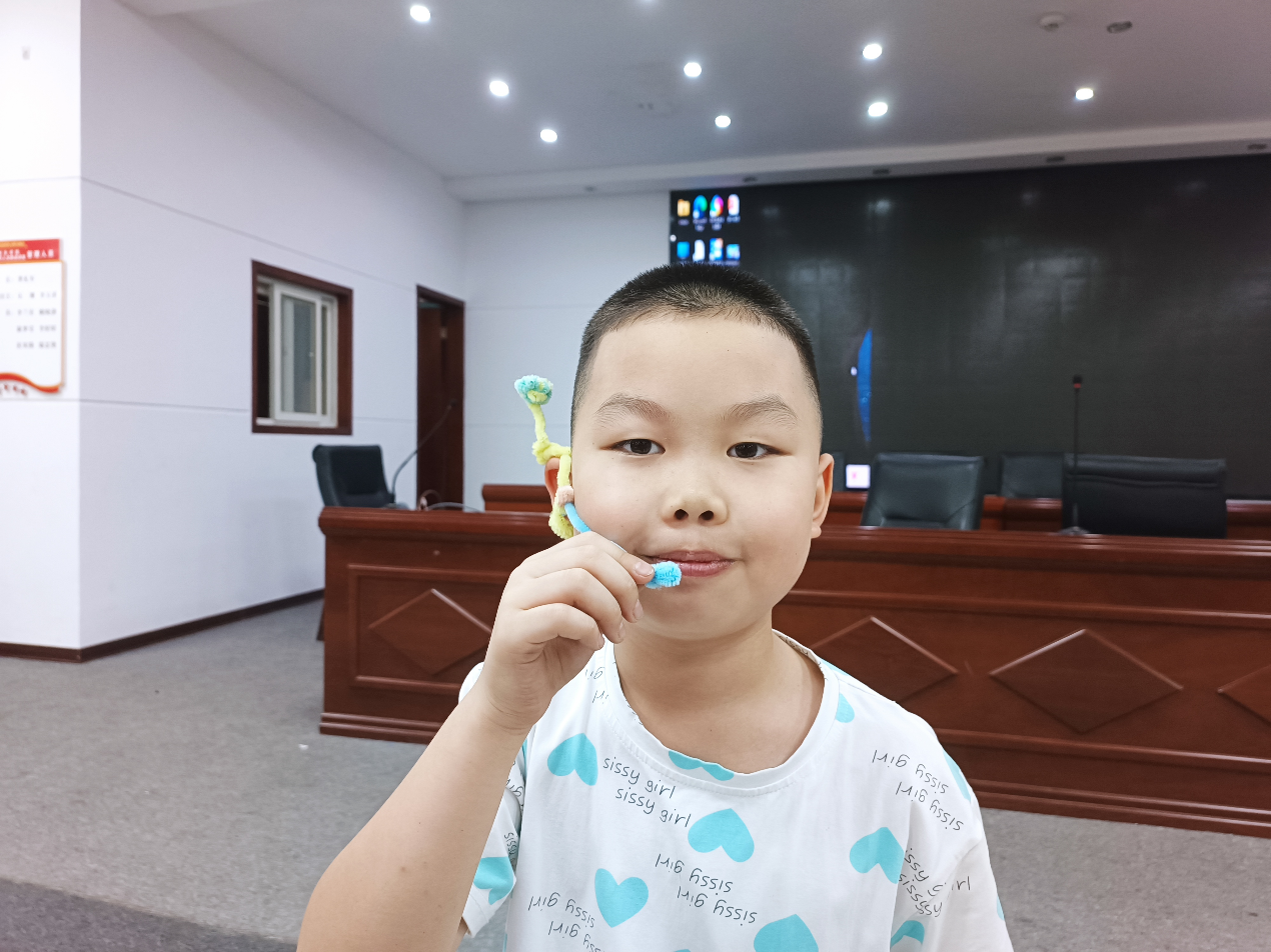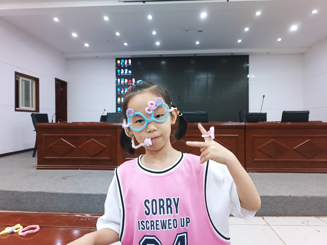课程伊始,志愿者老师为同学们分发了五颜六色的扭扭棒,同学们拿到后非常兴奋,迫不及待地开始扭出自己想要的形状。天马行空的同学们总是能给志愿者老师们带来许多惊喜。这次亦然,有些同学们用扭扭棒制作出了形状各异的对讲机,将其戴在自己的脑袋上,俨然一副专业接线员的样子。另一些同学则制作出了许多蝴蝶戒指和手指拖鞋,同学们玩得不亦乐乎。而在动手过程中也不乏有一些同学遇到了困难,他们在志愿者老师的细心指导与帮助下成功地扭出了他们想要的形状。课堂内一片欢声笑语,每一位同学的脸上都绽放出绚烂的笑脸。