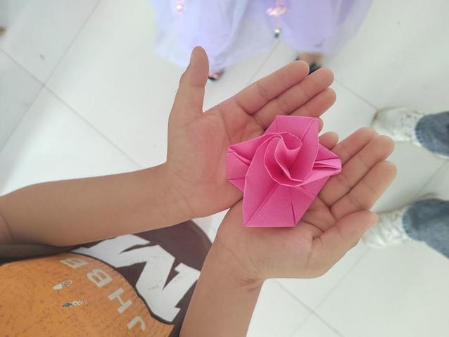 (图为学生在折纸课上完成的“玫瑰花”折纸作品 )