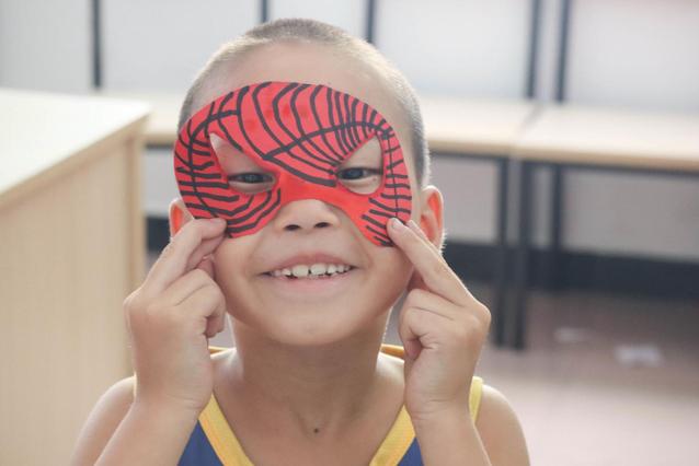 (图为学生戴上制作完成的面具对老师开怀大笑)